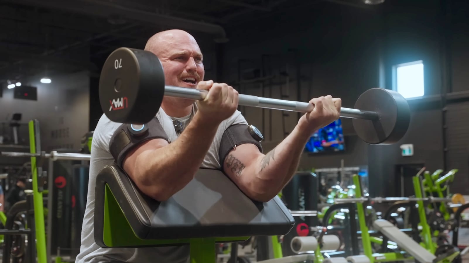 - Barbell Preacher Curl — Used the identical 70-pound (31.8-kilogram) curl bar